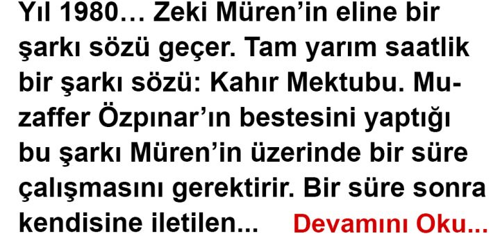 Yıl 1980… Zeki Müren’in eline bir şarkı sözü geçer. Tam yarım saatlik bir şarkı sözü: Kahır Mektubu. Muzaffer Özpınar’ın bestesini yaptığı bu şarkı Müren’in üzerinde bir süre çalışmasını gerektirir. Bir süre sonra kendisine iletilen...