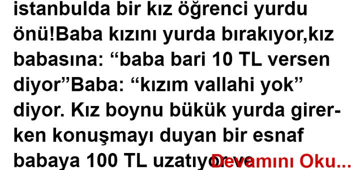 İstanbulda bir kız öğrenci yurdu önü! Baba kızını yurda bırakıyor, kız babasına: “baba bari 10 TL versen diyor” Baba: “kızım vallahi yok” diyor. Kız boynu bükük yurda girerken konuşmayı duyan bir esnaf babaya 100...