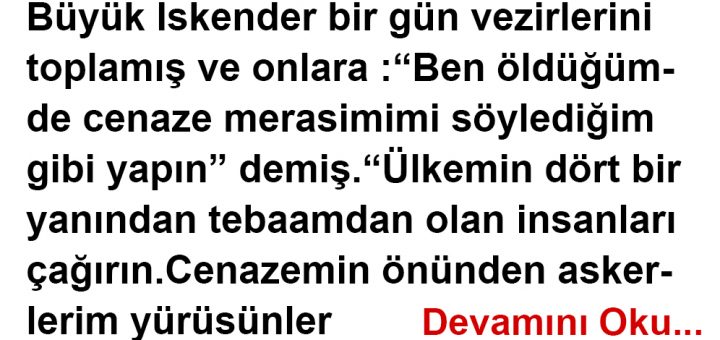 Büyük İskender bir gün vezirlerini toplamış ve onlara : “Ben öldüğümde cenaze merasimimi söylediğim gibi yapın” demiş. “Ülkemin dört bir yanından tebaamdan olan insanları çağırın. Cenazemin önünden askerlerim yürüsünler silahlarıyla, cenazemin sağından alimler yürüsünler...