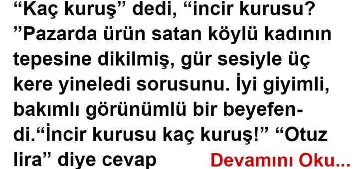 “Kaç kuruş” dedi, “incir kurusu?” Pazarda ürün satan köylü kadının tepesine dikilmiş, gür sesiyle üç kere yineledi sorusunu. İyi giyimli, bakımlı görünümlü bir beyefendi. “İncir kurusu kaç kuruş!” “Otuz lira” diye cevap vermişti oysa,...