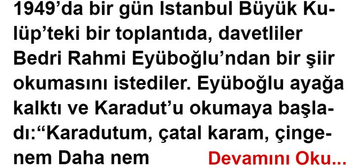 1949’da bir gün İstanbul Büyük Kulüp’teki bir toplantıda, davetliler Bedri Rahmi Eyüboğlu’ndan bir şiir okumasını istediler. Eyüboğlu ayağa kalktı ve Karadut’u okumaya başladı: “Karadutum, çatal karam, çingenem Daha nem olacaktın bir tanem Gülen ayvam,...