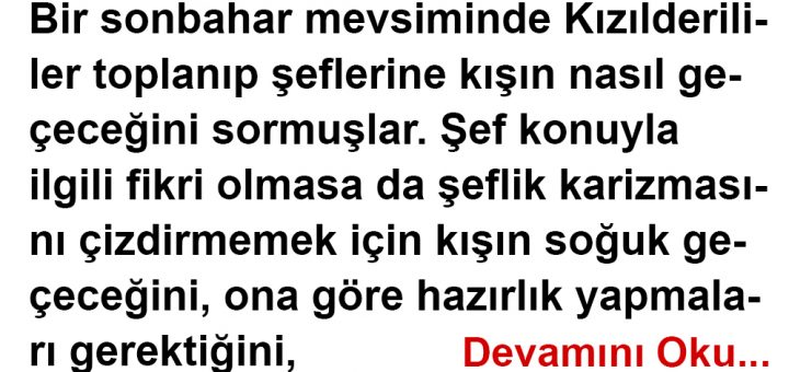 Bir sonbahar mevsiminde Kızılderililer toplanıp şeflerine kışın nasıl geçeceğini sormuşlar. Şef konuyla ilgili fikri olmasa da şeflik karizmasını çizdirmemek için kışın soğuk geçeceğini, ona göre hazırlık yapmaları gerektiğini, özellikle de odun toplamaları gerektiğini söylemiş....