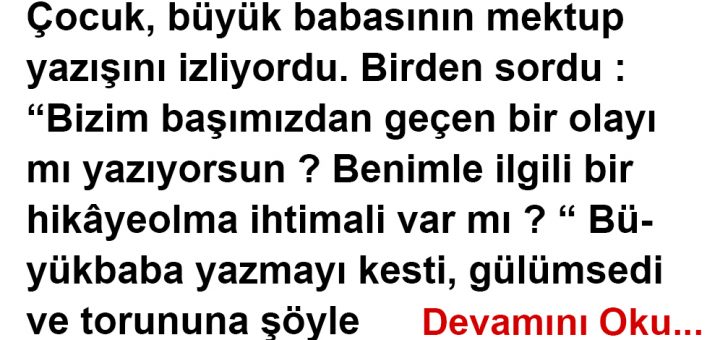 Çocuk, büyük babasının mektup yazışını izliyordu. Birden sordu : “Bizim başımızdan geçen bir olayı mı yazıyorsun ? Benimle ilgili bir hikâye olma ihtimali var mı ? “ Büyükbaba yazmayı kesti, gülümsedi ve torununa şöyle...