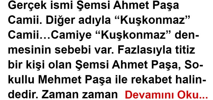 Gerçek ismi Şemsi Ahmet Paşa Camii. Diğer adıyla “Kuşkonmaz” Camii… Camiye “Kuşkonmaz” denmesinin sebebi var. Fazlasıyla titiz bir kişi olan Şemsi Ahmet Paşa, Sokullu Mehmet Paşa ile rekabet halindedir. Zaman zaman şakayla karışık atışırlar....