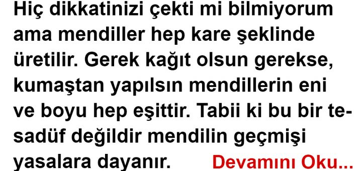 Hiç dikkatinizi çekti mi bilmiyorum ama mendiller hep kare şeklinde üretilir. Gerek kağıt olsun gerekse, kumaştan yapılsın mendillerin eni ve boyu hep eşittir. Tabii ki bu bir tesadüf değildir mendilin geçmişi yasalara dayanır. Fransa’da...