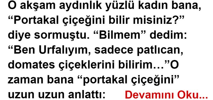 O akşam aydınlık yüzlü kadın bana, “Portakal çiçeğini bilir misiniz?” diye sormuştu. “Bilmem” dedim: “Ben Urfalıyım, sadece patlıcan, domates çiçeklerini bilirim…” O zaman bana “portakal çiçeğini” uzun uzun anlattı: “Portakal çiçeği, olgunlaşmış meyvesi ile...