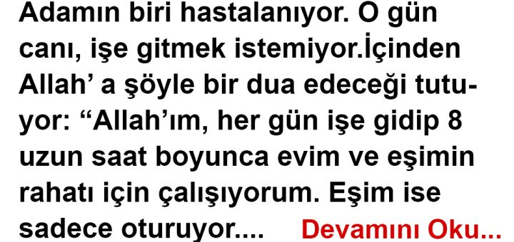 Adamın biri hastalanıyor. O gün canı, işe gitmek istemiyor. İçinden Allah’ a şöyle bir dua edeceği tutuyor: “Allah’ım, her gün işe gidip 8 uzun saat boyunca evim ve eşimin rahatı için çalışıyorum. Eşim ise...
