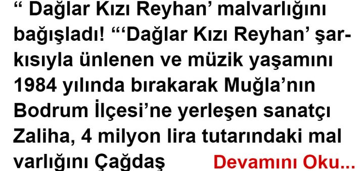 “ Dağlar Kızı Reyhan’ malvarlığını bağışladı! “ ‘Dağlar Kızı Reyhan’ şarkısıyla ünlenen ve müzik yaşamını 1984 yılında bırakarak Muğla’nın Bodrum İlçesi’ne yerleşen sanatçı Zaliha, 4 milyon lira tutarındaki mal varlığını Çağdaş Yaşamı Destekleme Derneği...