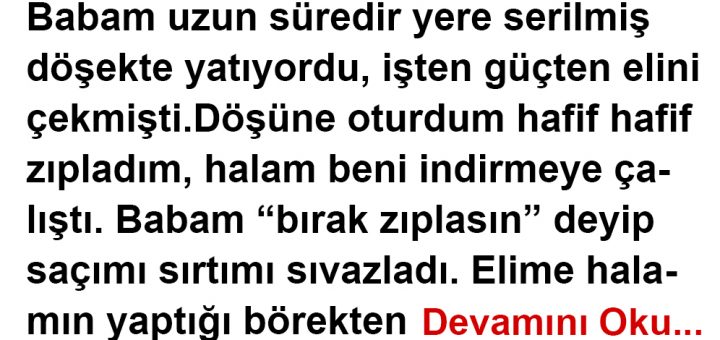 Babam uzun süredir yere serilmiş döşekte yatıyordu, işten güçten elini çekmişti. Döşüne oturdum hafif hafif zıpladım, halam beni indirmeye çalıştı. Babam “bırak zıplasın” deyip saçımı sırtımı sıvazladı. Elime halamın yaptığı börekten aldım bitirene kadar...