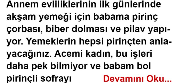 Annem evliliklerinin ilk günlerinde akşam yemeği için babama pirinç çorbası, biber dolması ve pilav yapıyor. Yemeklerin hepsi pirinçten anlayacağınız. Acemi kadın, bu işleri daha pek bilmiyor ve babam bol pirinçli sofrayı görünce şaşırıyor ama...