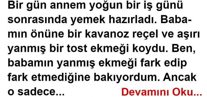 Bir gün annem yoğun bir iş günü sonrasında yemek hazırladı. Babamın önüne bir kavanoz reçel ve aşırı yanmış bir tost ekmeği koydu. Ben, babamın yanmış ekmeği fark edip fark etmediğine bakıyordum. Ancak o sadece...