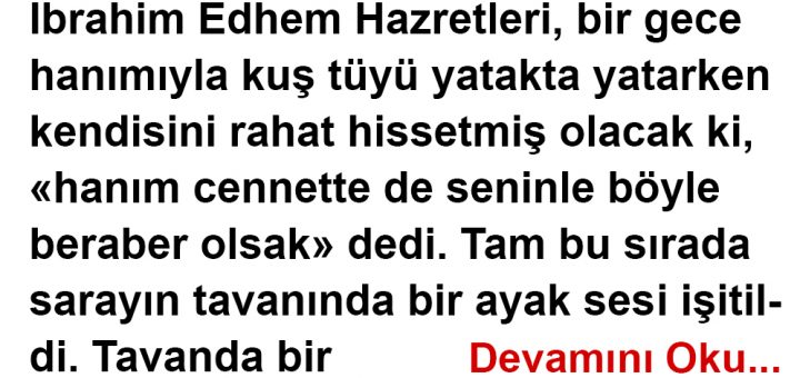 İbrahim Edhem Hazretleri, bir gece hanımıyla kuş tüyü yatakta yatarken kendisini rahat hissetmiş olacak ki, «hanım cennette de seninle böyle beraber olsak» dedi. Tam bu sırada sarayın tavanında bir ayak sesi işitildi. Tavanda bir...