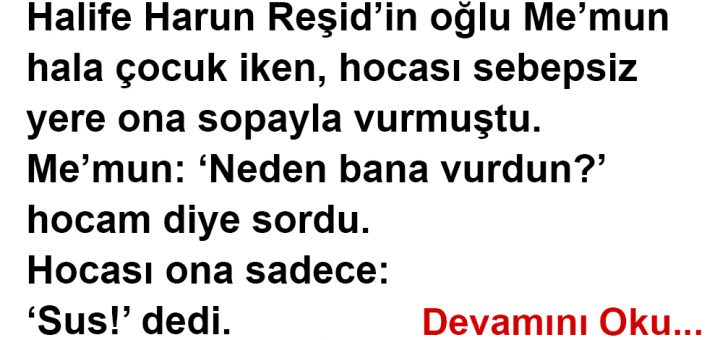 Halife Harun Reşid’in oğlu Me’mun hala çocuk iken, hocası sebepsiz yere ona sopayla vurmuştu. Me’mun: ‘Neden bana vurdun?’ hocam diye sordu. Hocası ona sadece: ‘Sus!’ dedi. Biraz konuştular. Me’mun tekrar sordu: hocam; ‘Neden bana...