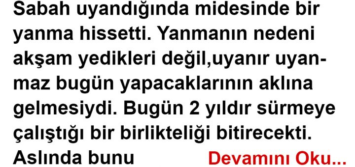Sabah uyandığında midesinde bir yanma hissetti. Yanmanın nedeni akşam yedikleri değil, uyanır uyanmaz bugün yapacaklarının aklına gelmesiydi. Bugün 2 yıldır sürmeye çalıştığı bir birlikteliği bitirecekti. Aslında bunu yapmakta geç bile kalmıştı. ‘Bitmeli dedi içinden,...