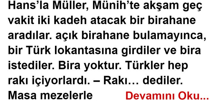 Hans’la Müller, Münih’te akşam geç vakit iki kadeh atacak bir birahane aradılar. açık birahane bulamayınca, bir Türk lokantasına girdiler ve bira istediler. Bira yoktur. Türkler hep rakı içiyorlardı. – Rakı… dediler. Masa mezelerle donatıldı,...
