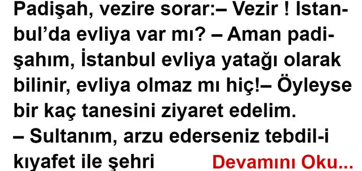 Padişah, vezire sorar: – Vezir !İstanbul’da evliya var mı? – Aman padişahım, İstanbul evliya yatağı olarak bilinir, evliya olmaz mı hiç! – Öyleyse bir kaç tanesini ziyaret edelim. – Sultanım, arzu ederseniz tebdil-i kıyafet...