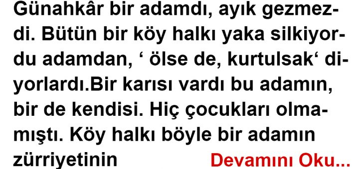 Günahkâr bir adamdı, ayık gezmezdi. Bütün bir köy halkı yaka silkiyordu adamdan, ‘ ölse de, kurtulsak ‘ diyorlardı. Bir karısı vardı bu adamın, bir de kendisi. Hiç çocukları olmamıştı. Köy halkı böyle bir adamın...
