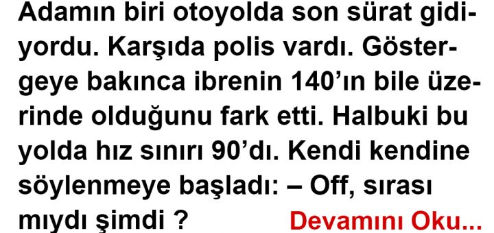 Adamın biri otoyolda son sürat gidiyordu. Karşıda polis vardı. Göstergeye bakınca ibrenin 140’ın bile üzerinde olduğunu fark etti. Halbuki bu yolda hız sınırı 90’dı. Kendi kendine söylenmeye başladı: – Off, sırası mıydı şimdi ?...