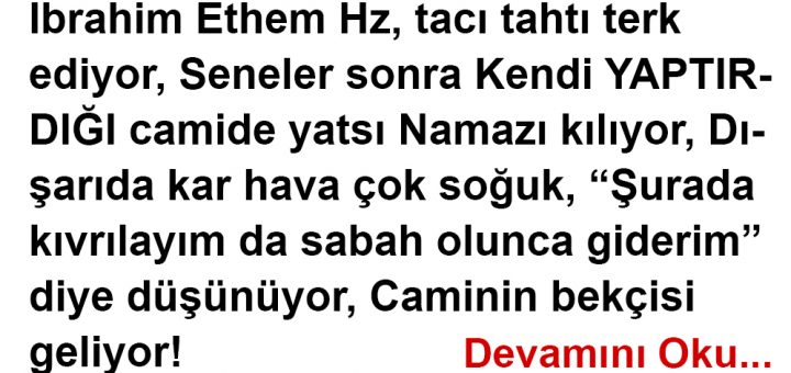 İbrahim Ethem Hz, tacı tahtı terk ediyor, Seneler sonra Kendi YAPTIRDIĞI camide yatsı Namazı kılıyor, Dışarıda kar hava çok soğuk, “Şurada kıvrılayım da sabah olunca giderim” diye düşünüyor, Caminin bekçisi geliyor! “Ne yapıyorsun” diyor...