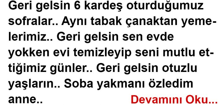 Geri gelsin 6 kardeş oturduğumuz sofralar.. Aynı tabak çanaktan yemelerimiz.. Geri gelsin sen evde yokken evi temizleyip seni mutlu ettiğimiz günler.. Geri gelsin otuzlu yaşların.. Soba yakmanı özledim anne.. Biz yataktayken daha sobanın külünü...