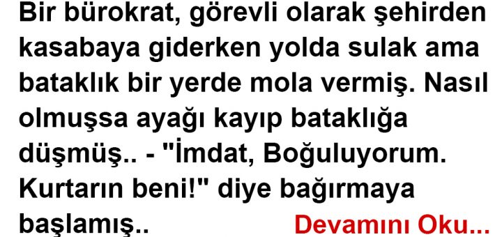 Bir bürokrat, görevli olarak şehirden kasabaya giderken yolda sulak ama bataklık bir yerde mola vermiş. Nasıl olmuşsa ayağı kayıp bataklığa düşmüş.. – “İmdat, Boğuluyorum. Kurtarın beni!” diye bağırmaya başlamış.. O sırada yakınlardan geçen bir...