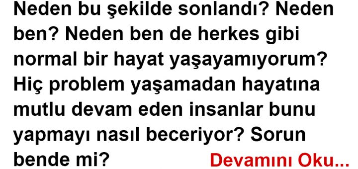 Neden bu şekilde sonlandı? Neden ben? Neden ben de herkes gibi normal bir hayat yaşayamıyorum? Hiç problem yaşamadan hayatına mutlu devam eden insanlar bunu yapmayı nasıl beceriyor? Sorun bende mi? Tabii ki tüm olumsuzlukların...