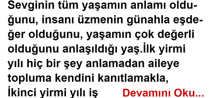 Sevginin tüm yaşamın anlamı olduğunu, insanı üzmenin günahla eşdeğer olduğunu, yaşamın çok değerli olduğunu anlaşıldığı yaş. İlk yirmi yılı hiç bir şey anlamadan aileye topluma kendini kanıtlamakla,İkinci yirmi yılı iş güç çoluk çocuk aile...
