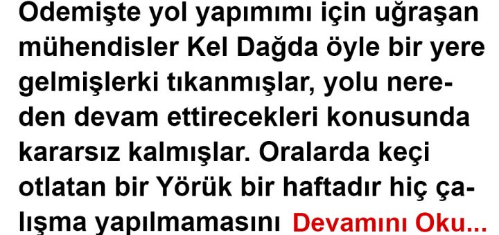 Ödemişte yol yapımımı için uğraşan mühendisler Kel Dağda öyle bir yere gelmişlerki tıkanmışlar, yolu nereden devam ettirecekleri konusunda kararsız kalmışlar. Oralarda keçi otlatan bir Yörük bir haftadır hiç çalışma yapılmamasını merak etmiş ve Karayolları...