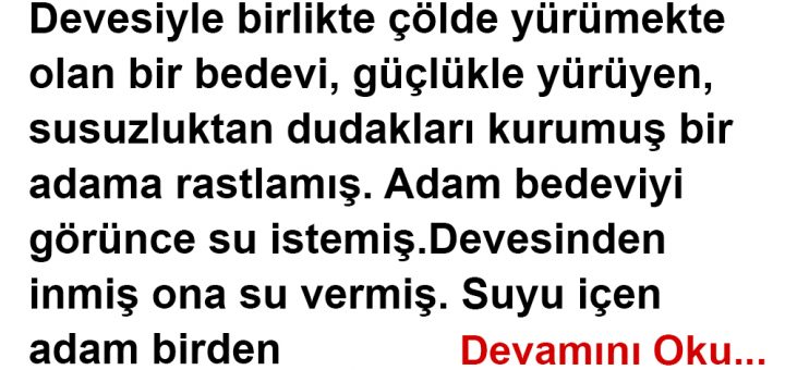 Devesiyle birlikte çölde yürümekte olan bir bedevi, güçlükle yürüyen, susuzluktan dudakları kurumuş bir adama rastlamış. Adam bedeviyi görünce su istemiş. Devesinden inmiş ona su vermiş. Suyu içen adam birden bedeviyi iterek deveye atladığı gibi...