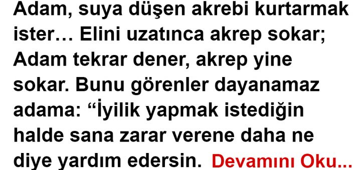 Adam, suya düşen akrebi kurtarmak ister… elini uzatınca akrep sokar; adam tekrar dener, akrep yine sokar.. Bunu görenler dayanamaz adama: “İyilik yapmak istediğin halde sana zarar verene daha ne diye yardım edersin.” der. Adamın cevabı...