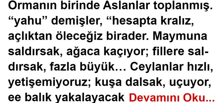 Ormanın birinde Aslanlar toplanmış. “yahu” demişler, “hesapta kralız, açlıktan öleceğiz birader. Maymuna saldırsak, ağaca kaçıyor; fillere saldırsak, fazla büyük… Ceylanlar hızlı, yetişemiyoruz; kuşa dalsak, uçuyor, eee balık yakalayacak halimiz de yok… N’aapsak? ” Bir...