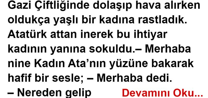 Gazi Çiftliğinde dolaşıp hava alırken oldukça yaşlı bir kadına rastladık. Atatürk attan inerek bu ihtiyar kadının yanına sokuldu. – Merhaba nine Kadın Ata’nın yüzüne bakarak hafif bir sesle; – Merhaba dedi. – Nereden gelip...