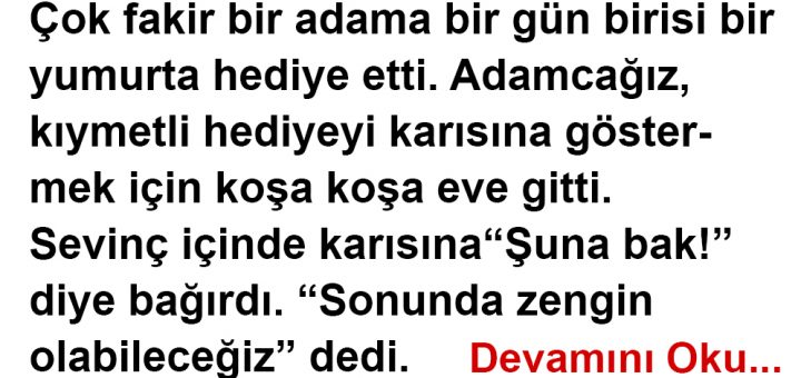 Çok fakir bir adama bir gün birisi bir yumurta hediye etti. Adamcağız, kıymetli hediyeyi karısına göstermek için koşa koşa eve gitti. Sevinç içinde karısına; “Şuna bak!” diye bağırdı. “Sonunda zengin olabileceğiz” dedi. Karısı; “Hediye...