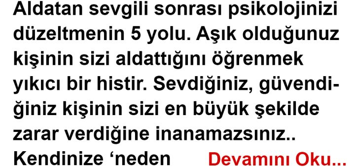 Aldatan sevgili sonrası psikolojinizi düzeltmenin 5 yolu. Aşık olduğunuz kişinin sizi aldattığını öğrenmek yıkıcı bir histir. Sevdiğiniz, güvendiğiniz kişinin sizi en büyük şekilde zarar verdiğine inanamazsınız.. Kendinize ‘neden ben?’ Veya ‘ Yeteri kadar iyi...