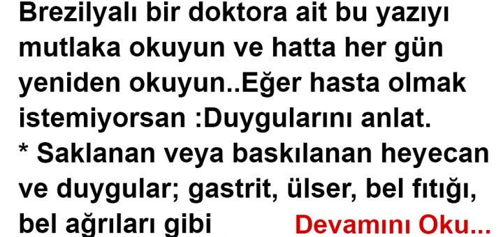 Brezilyalı bir doktora ait bu yazıyı mutlaka okuyun ve hatta her gün yeniden okuyun.. Eğer hasta olmak istemiyorsan : Duygularını anlat. Saklanan veya baskılanan heyecan ve duygular; gastrit, ülser, bel fıtığı, bel ağrıları gibi...