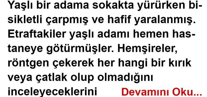 Yaşlı bir adama sokakta yürürken bisikletli çarpmış ve hafif yaralanmış. Etraftakiler yaşlı adamı hemen hastaneye götürmüşler. Hemşireler, röntgen çekerek her hangi bir kırık veya çatlak olup olmadığını inceleyeceklerini söylemişler. Yaşlı adam huzursuzlanmış; “acelesi olduğunu,...