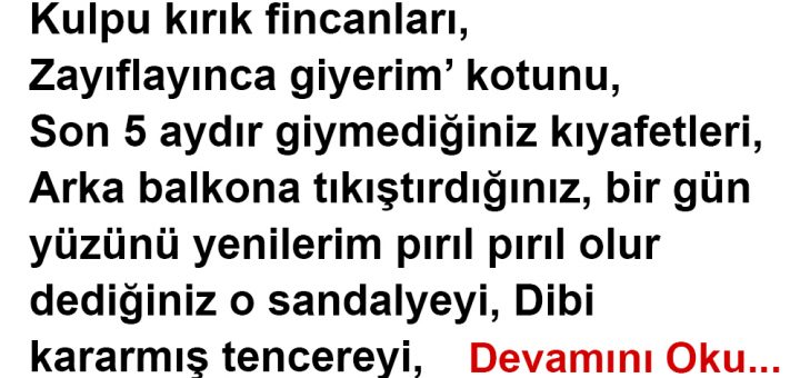 Kulpu kırık fincanları, Zayıflayınca giyerim’ kotunu, Son 5 aydır giymediğiniz kıyafetleri, Arka balkona tıkıştırdığınız, bir gün yüzünü yenilerim pırıl pırıl olur dediğiniz o sandalyeyi, Dibi kararmış tencereyi, Taşındığınız hangi evden kaldığı, hangi kapıyı açtığı...