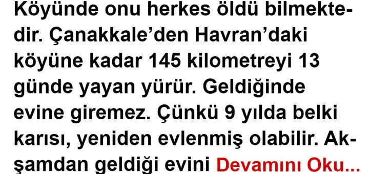 Köyünde onu herkes öldü bilmektedir. Çanakkale’den Havran’daki köyüne kadar 145 kilometreyi 13 günde yayan yürür. Geldiğinde evine giremez. Çünkü 9 yılda belki karısı, yeniden evlenmiş olabilir. Akşamdan geldiği evini sabaha kadar göz hapsine alır....