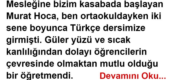 BİR KÖY OKULUNUN YEMEKHANESİNDE… Mesleğine bizim kasabada başlayan Murat Hoca, ben ortaokuldayken iki sene boyunca Türkçe dersimize girmişti. Güler yüzü ve sıcak kanlılığından dolayı öğrencilerin çevresinde olmaktan mutlu olduğu bir öğretmendi. Dersleri sevilirdi ve...