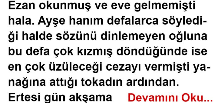 Ezan okunmuş ve eve gelmemişti hala. Ayşe hanım defalarca söylediği halde sözünü dinlemeyen oğluna bu defa çok kızmış döndüğünde ise en çok üzüleceği cezayı vermişti yanağına attığı tokadın ardından. Ertesi gün akşama kadar odasında...