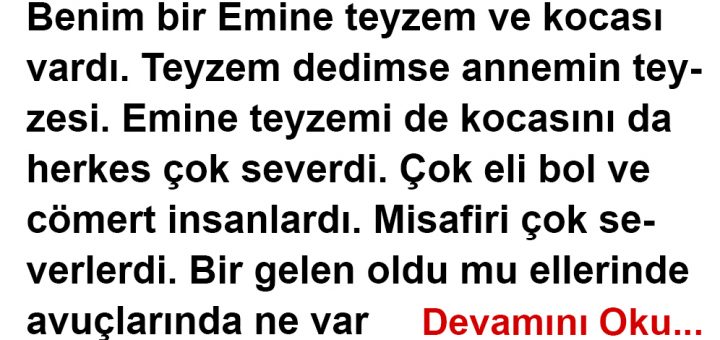 Benim bir Emine teyzem ve kocası vardı. Teyzem dedimse annemin teyzesi. Emine teyzemi de kocasını da herkes çok severdi. Çok eli bol ve cömert insanlardı. Misafiri çok severlerdi. Bir gelen oldu mu ellerinde avuçlarında...