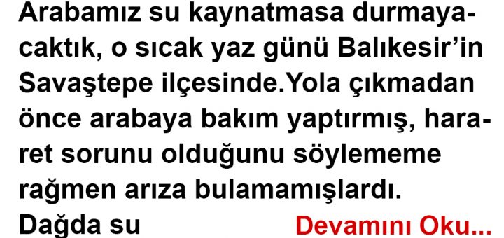 Arabamız su kaynatmasa durmayacaktık, o sıcak yaz günü Balıkesir’in Savaştepe ilçesinde. Yola çıkmadan önce arabaya bakım yaptırmış, hararet sorunu olduğunu söylememe rağmen arıza bulamamışlardı. Dağda su kaynattıktan sonra motorun soğumasını bekleyip ancak Savaştepe’ye kadar...