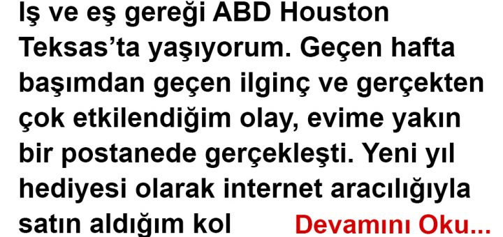 İş ve eş gereği ABD Houston Teksas’ta yaşıyorum. Geçen hafta başımdan geçen ilginç ve gerçekten çok etkilendiğim olay, evime yakın bir postanede gerçekleşti. Yeni yıl hediyesi olarak internet aracılığıyla satın aldığım kol saati paketten...
