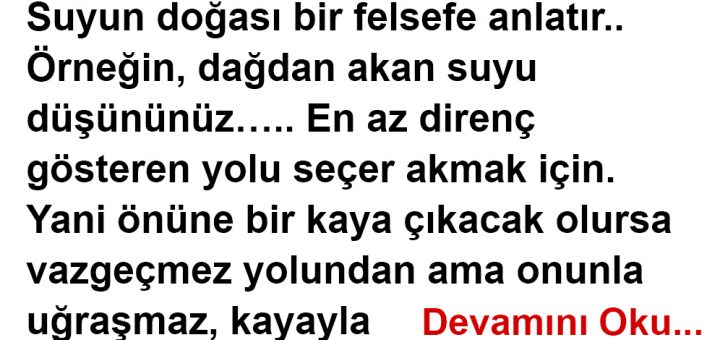 *“SU FELSEFESİ”* – Suyun doğası bir felsefe anlatır.. -Örneğin, dağdan akan suyu düşününüz….. – En az direnç gösteren yolu seçer akmak için. – Yani önüne bir kaya çıkacak olursa vazgeçmez yolundan ama onunla uğraşmaz,...