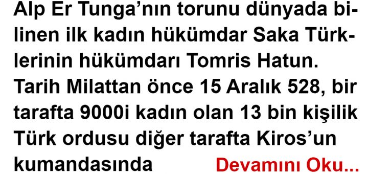 Alp Er Tunga’nın torunu dünyada bilinen ilk kadın hükümdar Saka Türklerinin hükümdarı Tomris Hatun. Tarih Milattan önce 15 Aralık 528, bir tarafta 9000i kadın olan 13 bin kişilik Türk ordusu diğer tarafta Kiros’un kumandasında...
