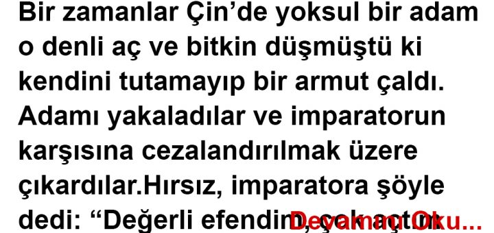 Bir zamanlar Çin’de yoksul bir adam o denli aç ve bitkin düşmüştü ki kendini tutamayıp bir armut çaldı. Adamı yakaladılar ve imparatorun karşısına cezalandırılmak üzere çıkardılar. Hırsız, imparatora şöyle dedi: “Değerli efendim, çok açtım...