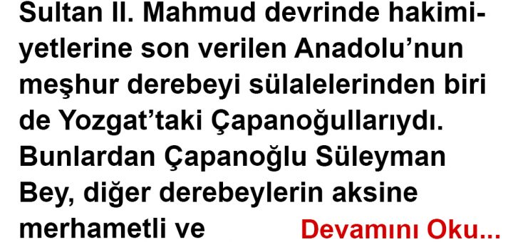 Sultan II. Mahmud devrinde hakimiyetlerine son verilen Anadolu’nun meşhur derebeyi sülalelerinden biri de Yozgat’taki Çapanoğullarıydı. Bunlardan Çapanoğlu Süleyman Bey, diğer derebeylerin aksine merhametli ve zayıfları koruyan bir beydi. Bir gün, zayıflıktan iskeleti çıkmış bir...