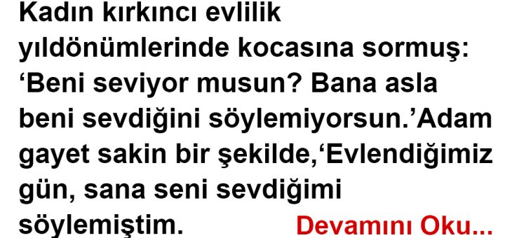 Kadın kırkıncı evlilik yıldönümlerinde kocasına sormuş: ‘Beni seviyor musun? Bana asla beni sevdiğini söylemiyorsun.’ Adam gayet sakin bir şekilde, ‘Evlendiğimiz gün, sana seni sevdiğimi söylemiştim. Durumda bir değişiklik olursa sana haber veririm.’ demiş.