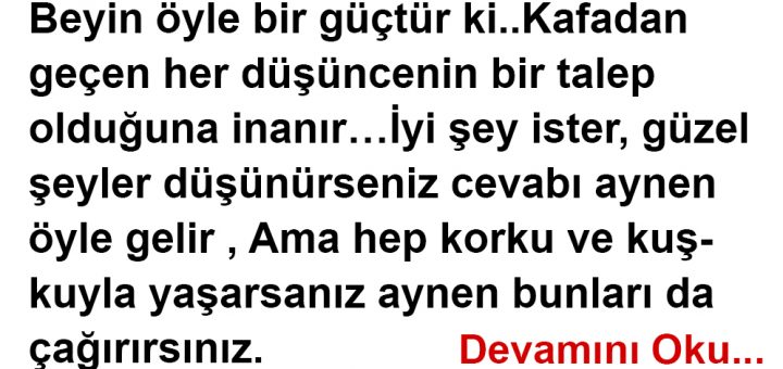 Beyin öyle bir güçtür ki.. Kafadan geçen her düşüncenin bir talep olduğuna inanır…İyi şey ister, güzel şeyler düşünürseniz cevabı aynen öyle gelir , Ama hep korku ve kuşkuyla yaşarsanız aynen bunları da çağırırsınız. Trafik...