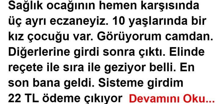 Sağlık ocağının hemen karşısında üç ayrı eczaneyiz. 10 yaşlarında bir kız çocuğu var. Görüyorum camdan. Diğerlerine girdi sonra çıktı. Elinde reçete ile sıra ile geziyor belli. En son bana geldi. Sisteme girdim 22 TL...